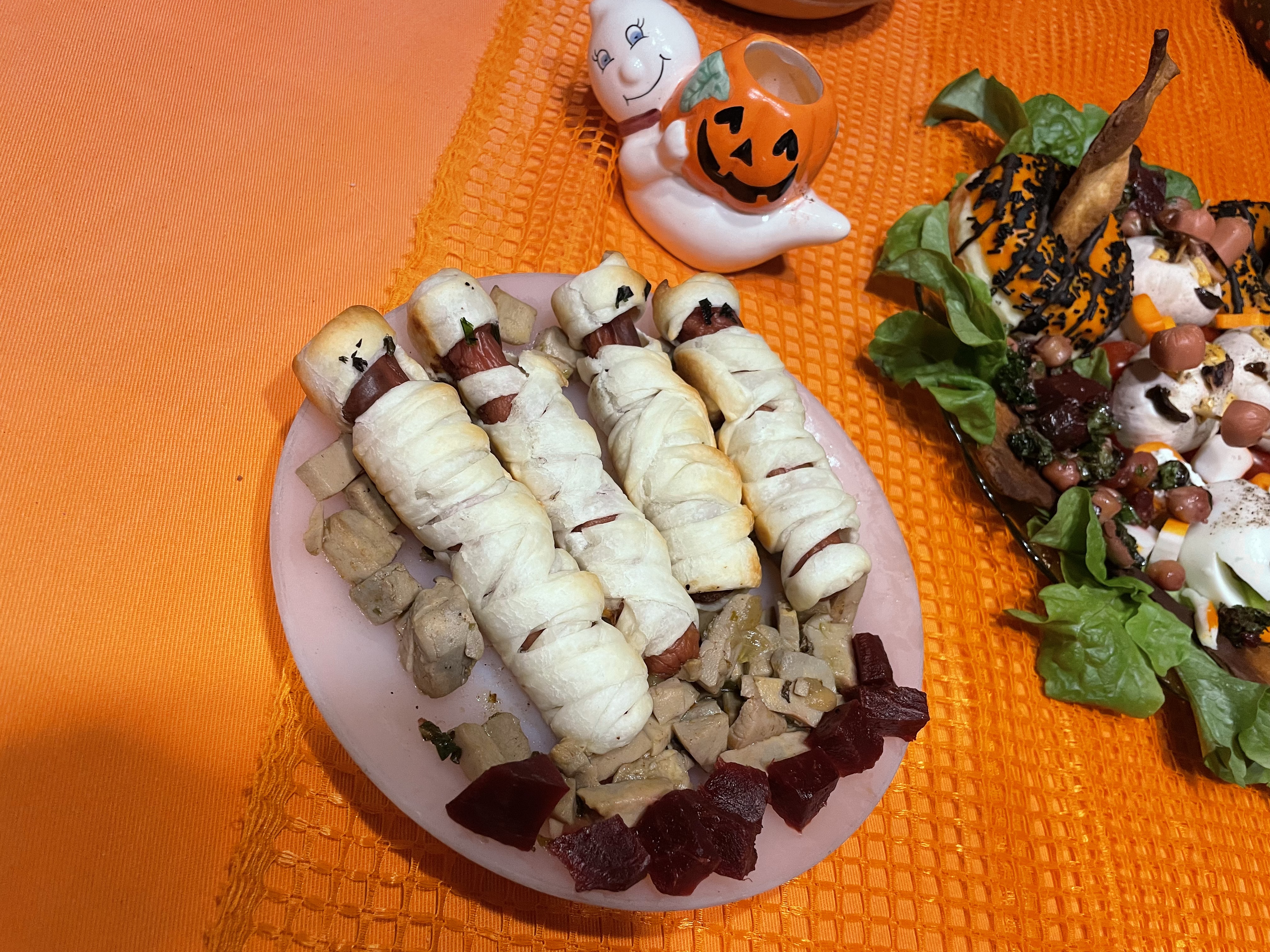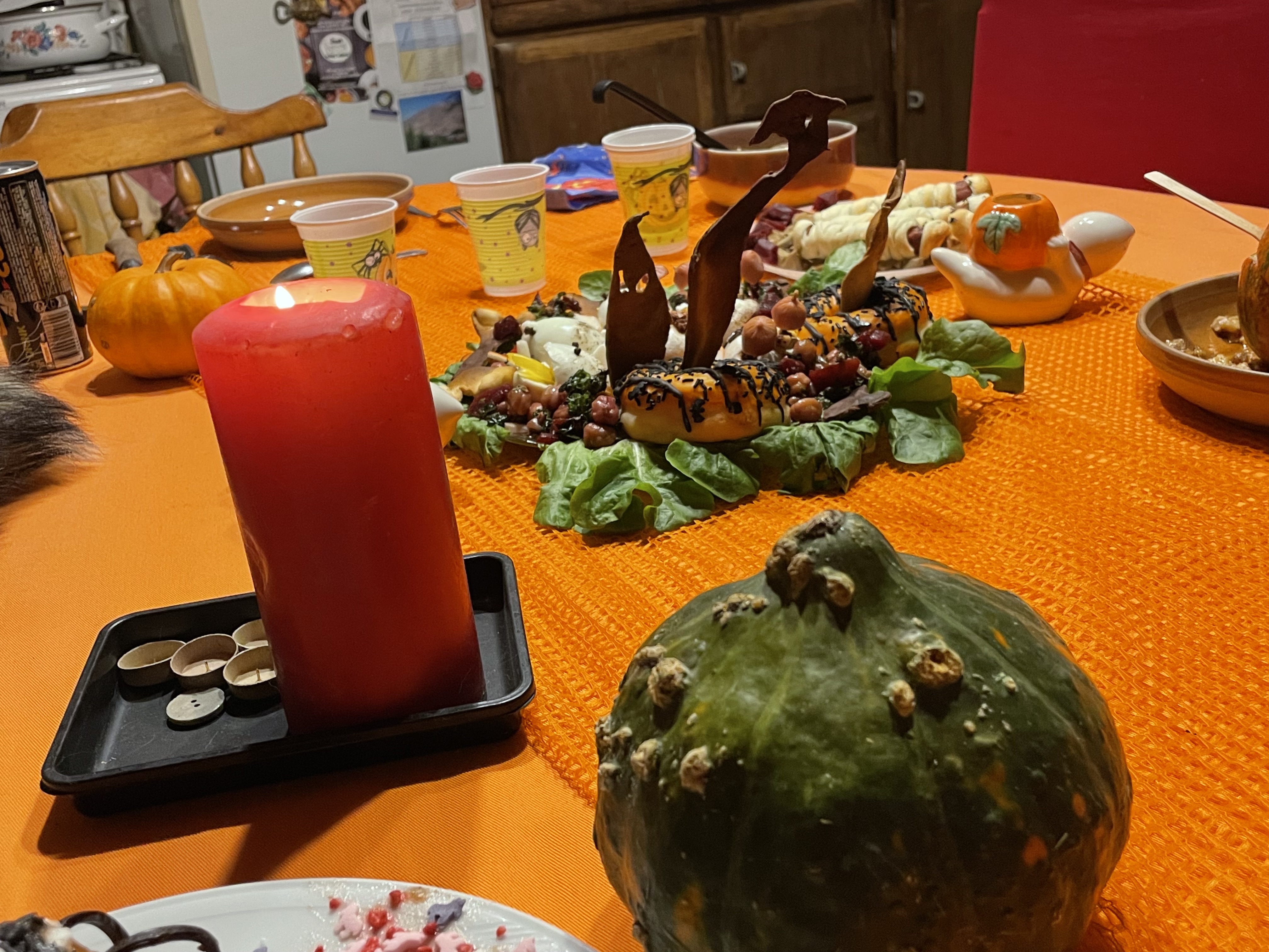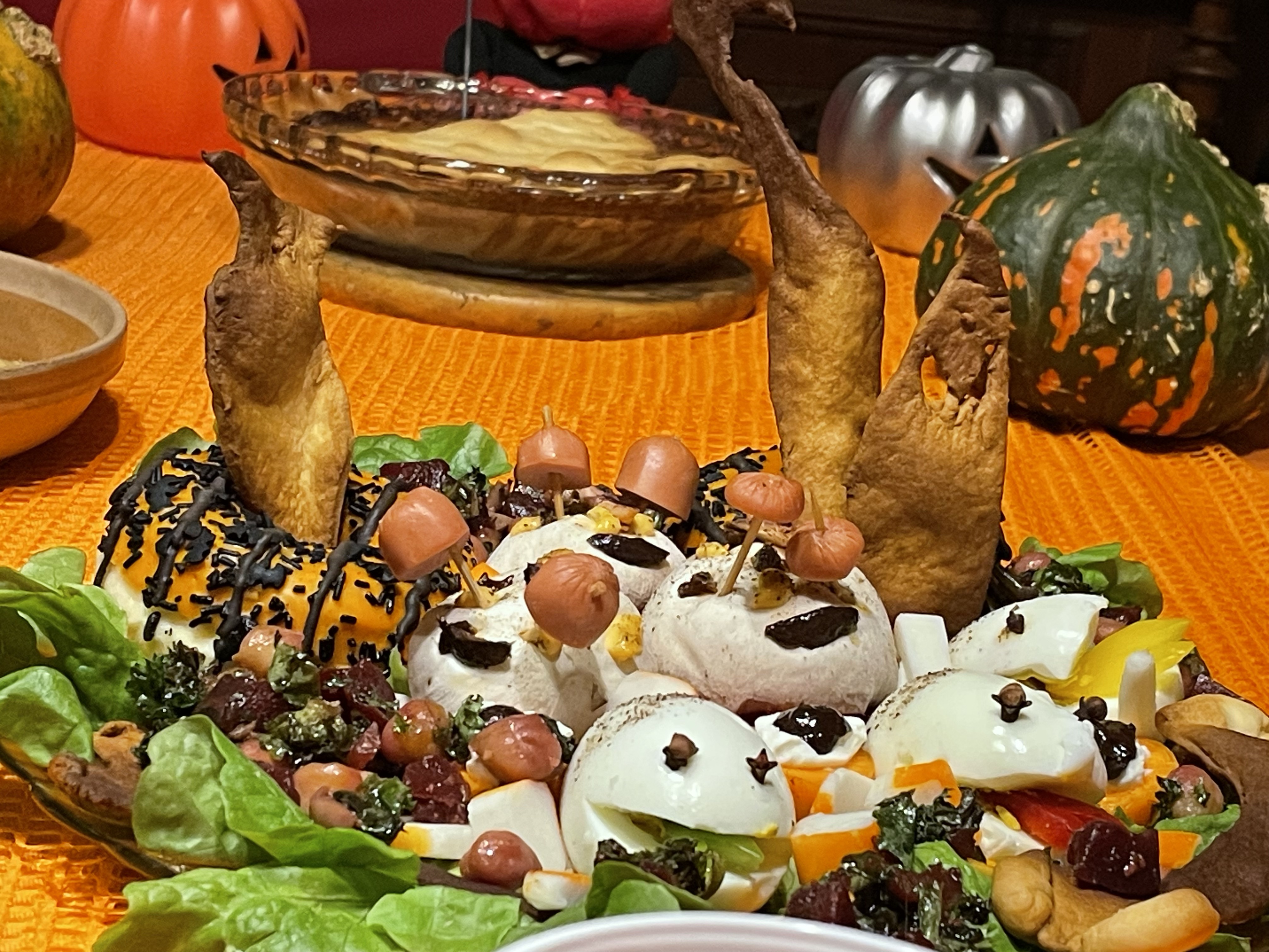 Ce n'est pas parce que je me trouvais seule que je n'allais pas fêter Halloween ou All Hallow Even qui veut dire la veille de tous les saints ! Fête païenne disent certains mais ce n'est pas tout à fait exact si l'on connait les origines de cette fête qui a 2 500 ans, que les Celtes célébraient mais qui s'appelait aussi la fête de Samain ! Fin d'octobre qui était aussi la fin de l'année pas comme à présent au 31 décembre ! Bref après cette petite explication je vais vous dire que j'aime célébrer cette fête où les gens enfilaient des costumes effrayants pour éloigner les mauvais esprits ! Donc, je fais de même pour éloigner les mauvais esprits de la maison ! Hihihi ! Et puis je n'allais pas manquer cet évènement encore un prétexte pour faire la fête ! Alors, toute l'après-midi j'ai préparé mes petits ingrédients ! J'avais aussi préparer des bonbons au cas où il y aurait eu des enfants dans le village ! Que nenni ! Mais j'ai eu la surprise de trouer 3 bonbons dans ma boite aux lettres le lendemain ! Comme quoi, même seule on peut très bien passer de bons moments ! Oui ! Oui ! Et je peux dire que durant les années passées avec toutes les personnes présentes, on s'est très bien amusées aussi et qu'importe l'âge !