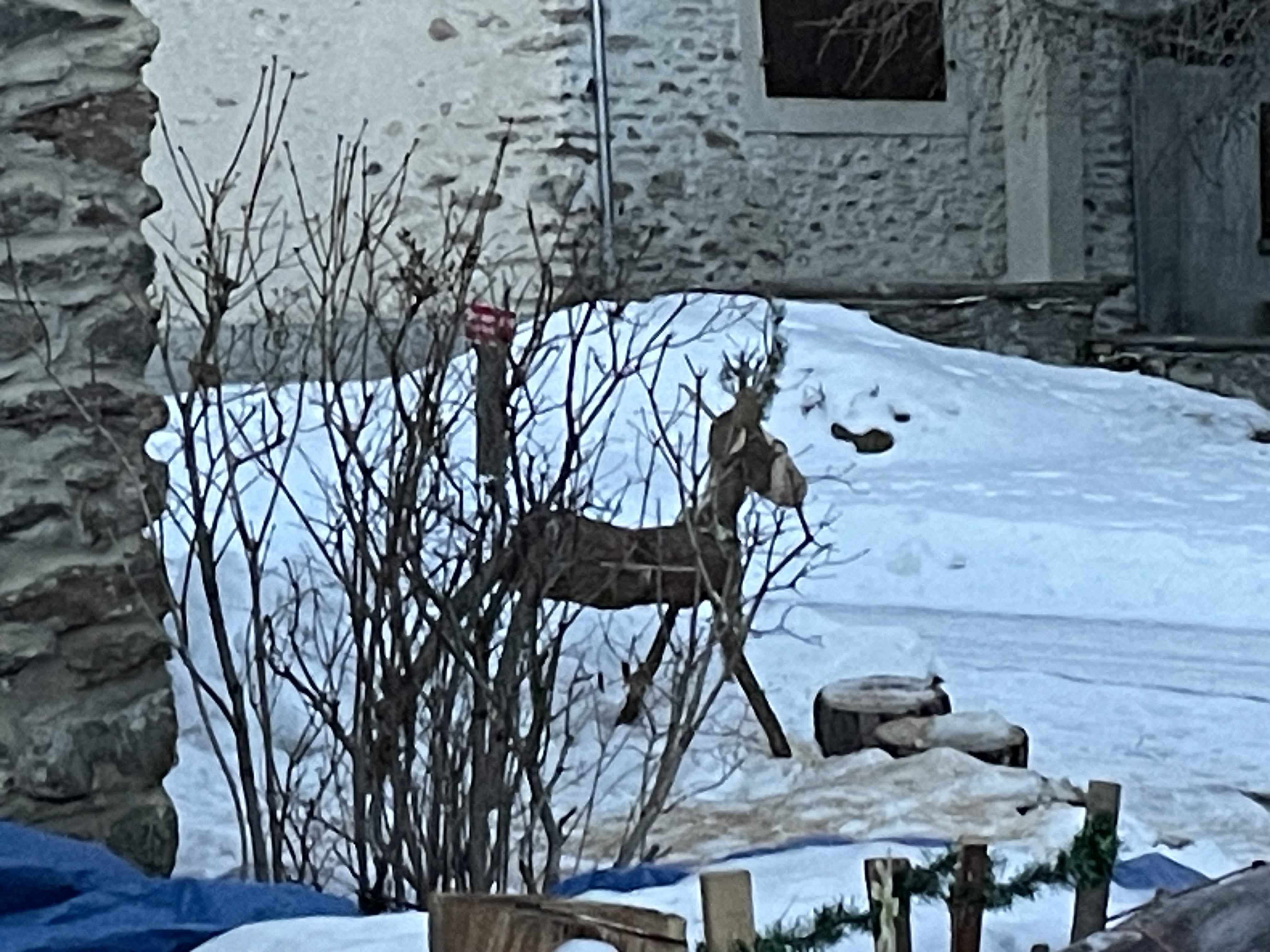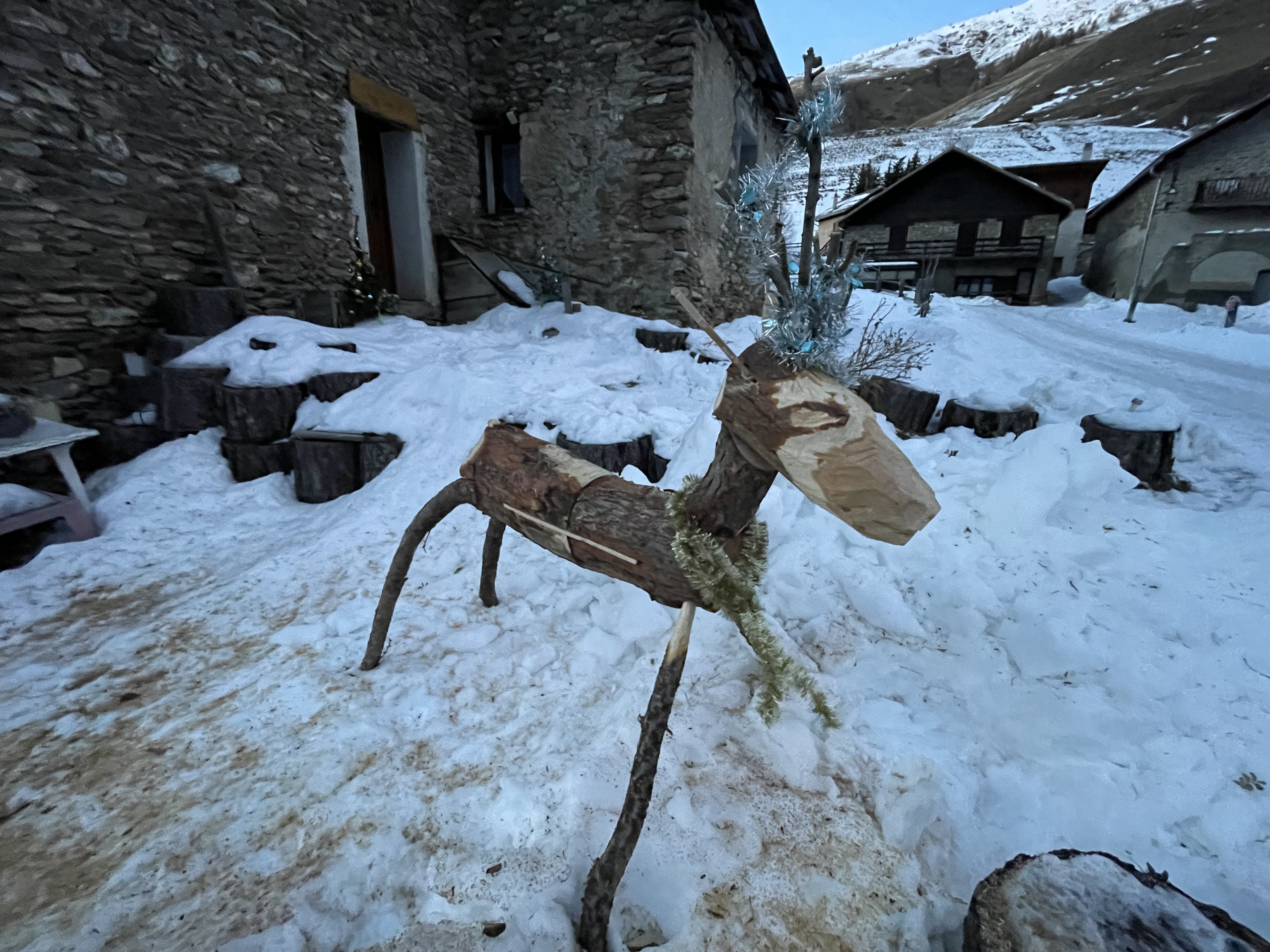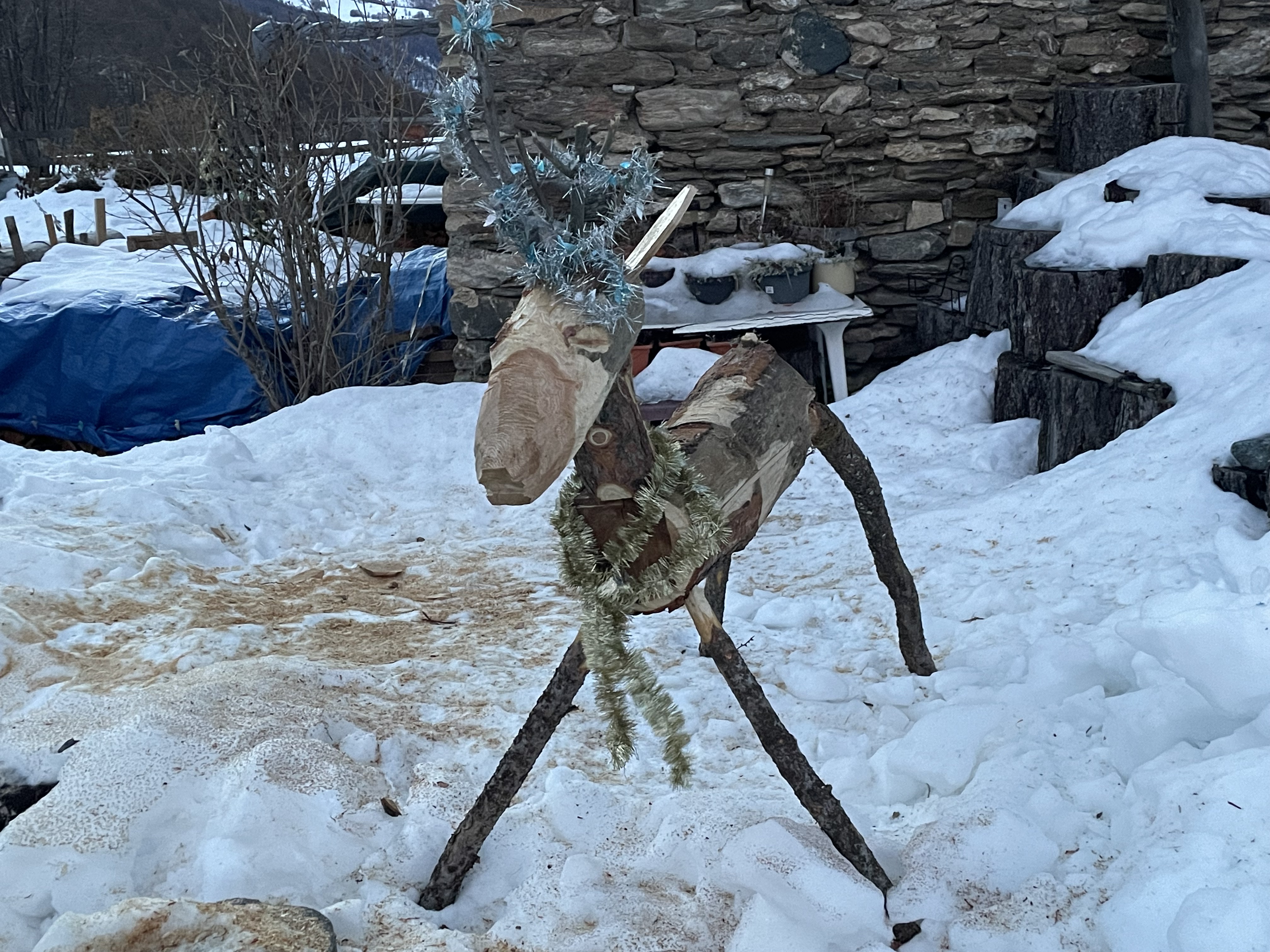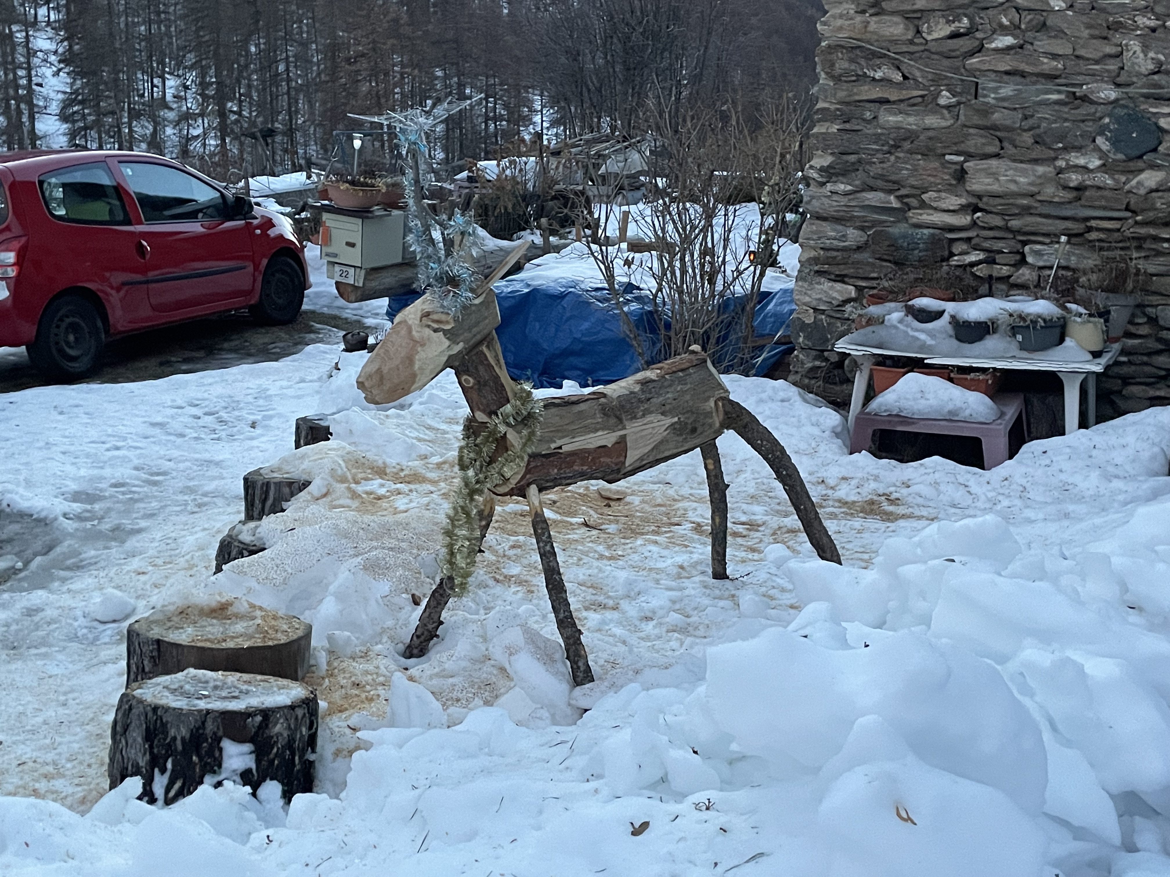 Dans le jardin j'ai aussi quelqu'un qui est à la retraite, c'est le renne Nez-Rouge !! Ben oui ! Il a été remplacé et maintenant il se repose chez moi pour toujours ! En fait, je voulais un petit animal en bois comme il y a à Abries en décoration ! Et Christian m'a fabriqué ce joli petit renne ! Il est interdit de monter dessus car il est seulement assemblé et non cloué ! Il est trop migon !