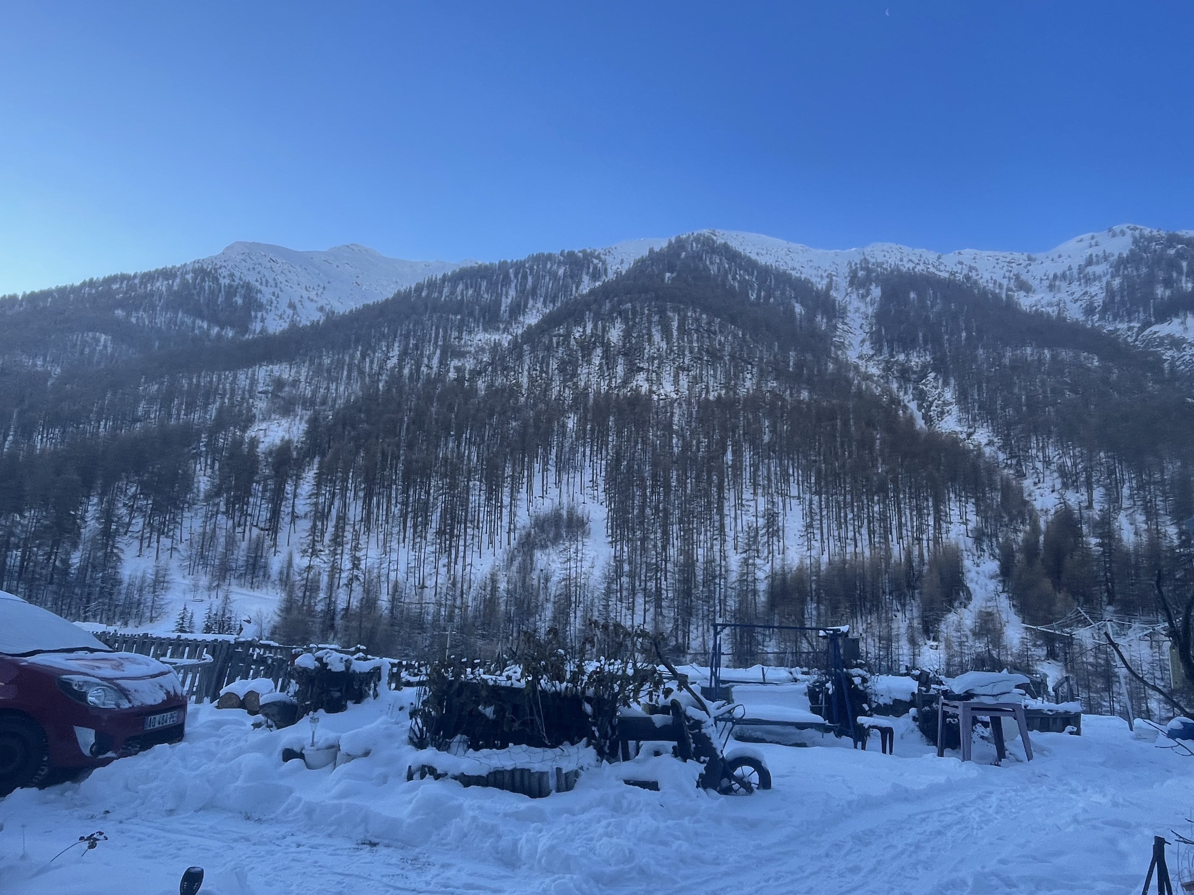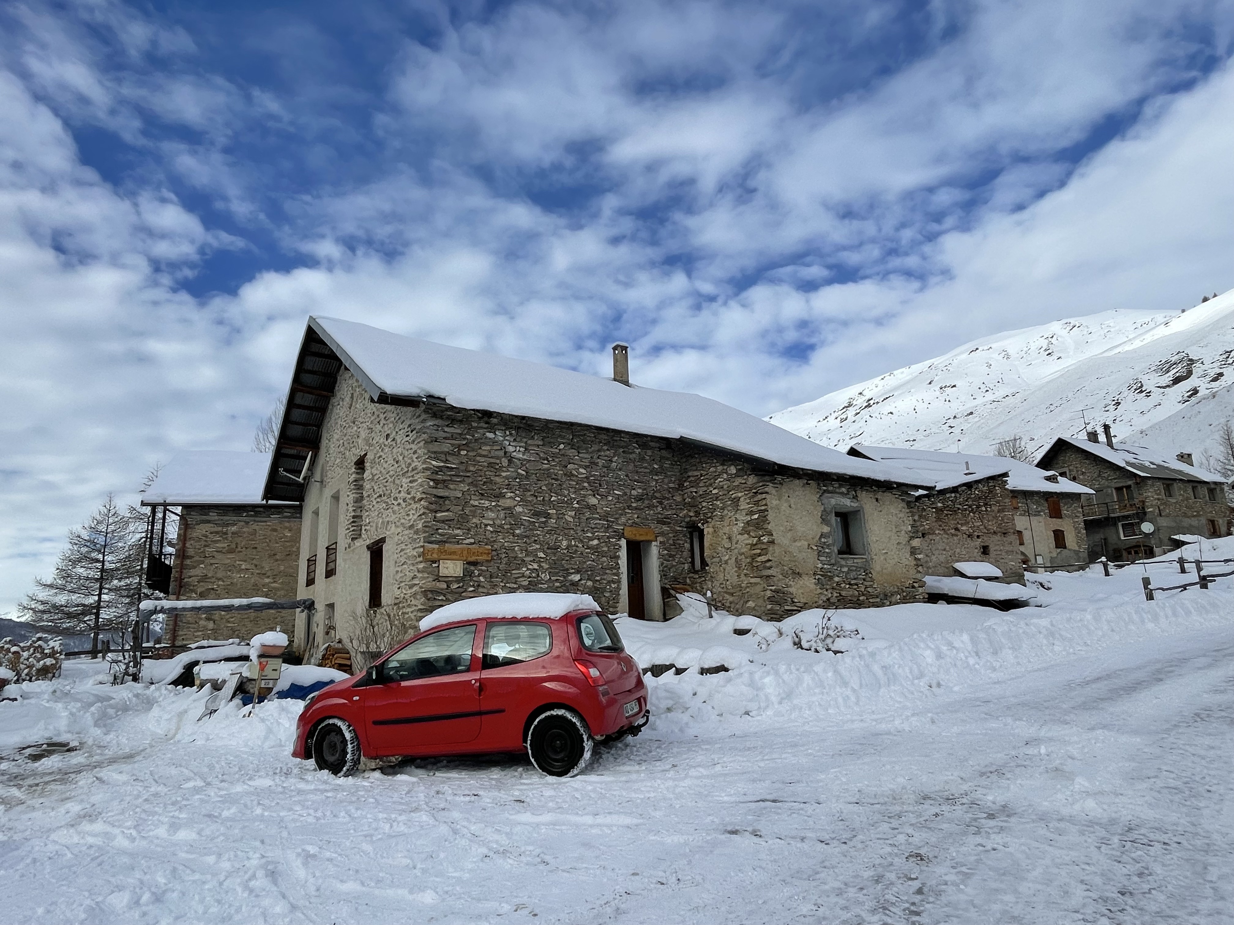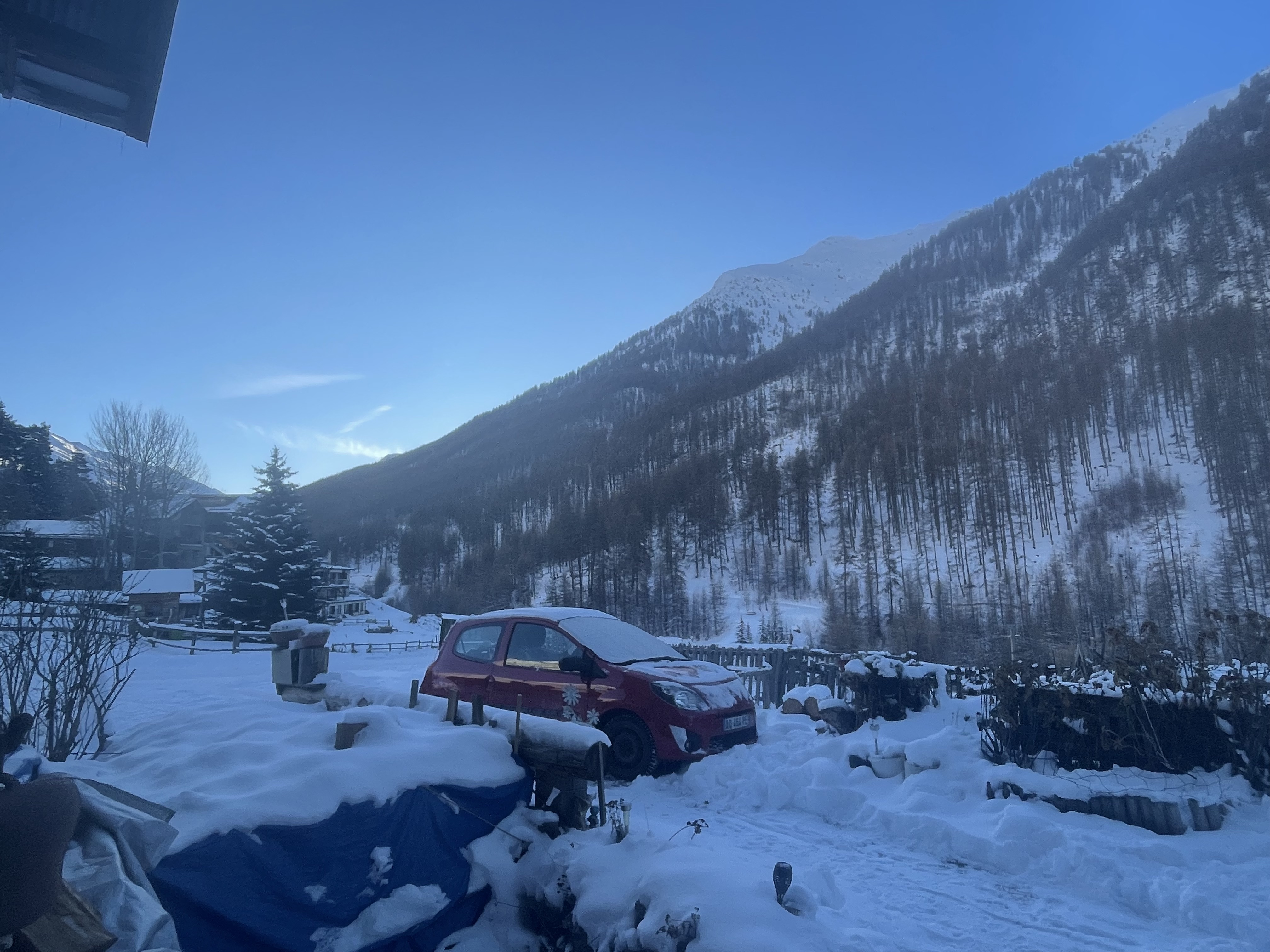 On la voudrait bien qu'elle se maintienne vraiment, mais la météo est vraiment difficile à cerner en ce moment ! Parfois elle tombe belle à souhait mais le lendemain, la pluie se met à tomber, la transformant en paquet de glace quand le thermomètre descend ! Le soleil a disparu sur Fontgillarde mais quand il ne neige pas, le ciel bleu Queyras est bien de circonstance !