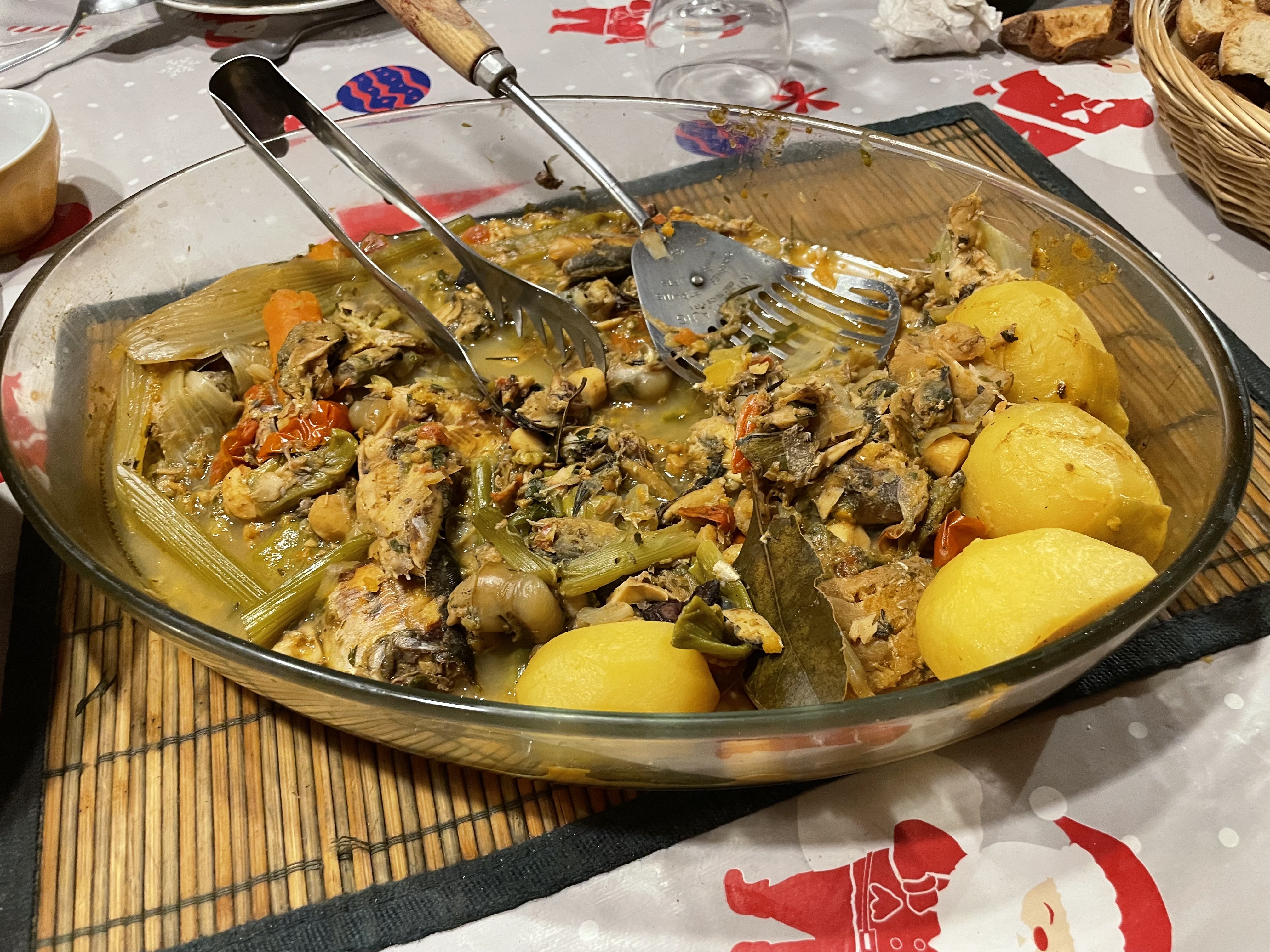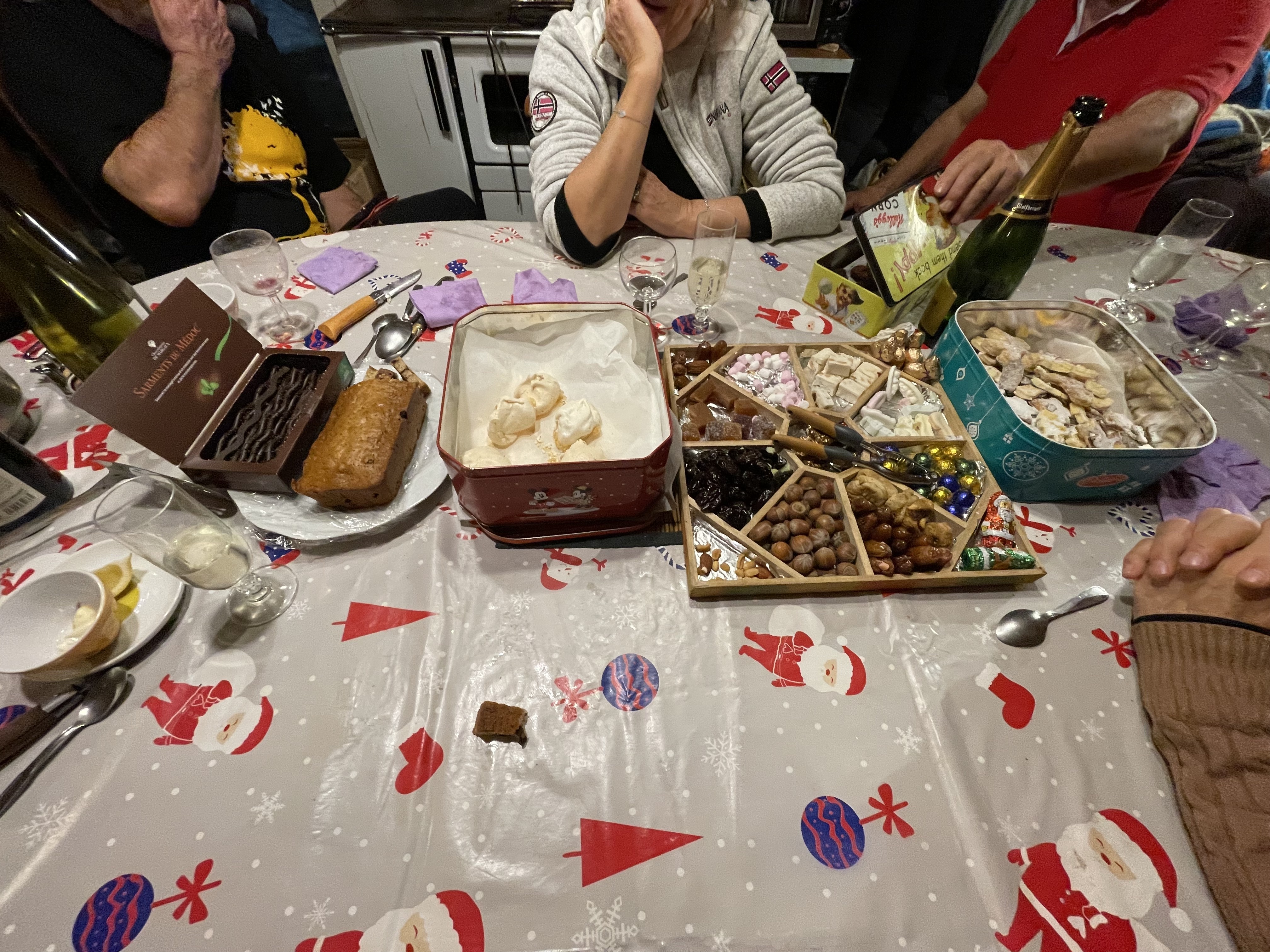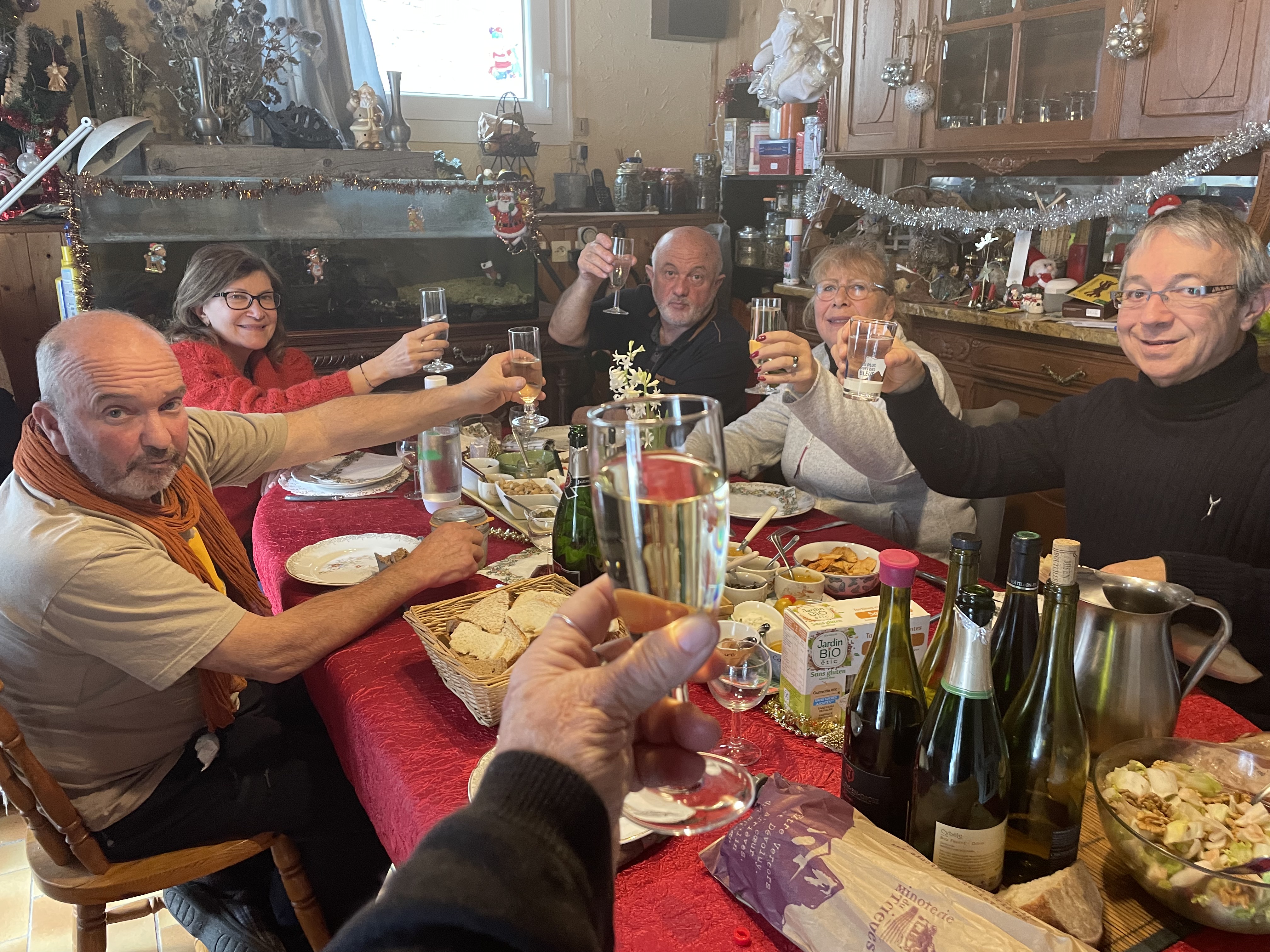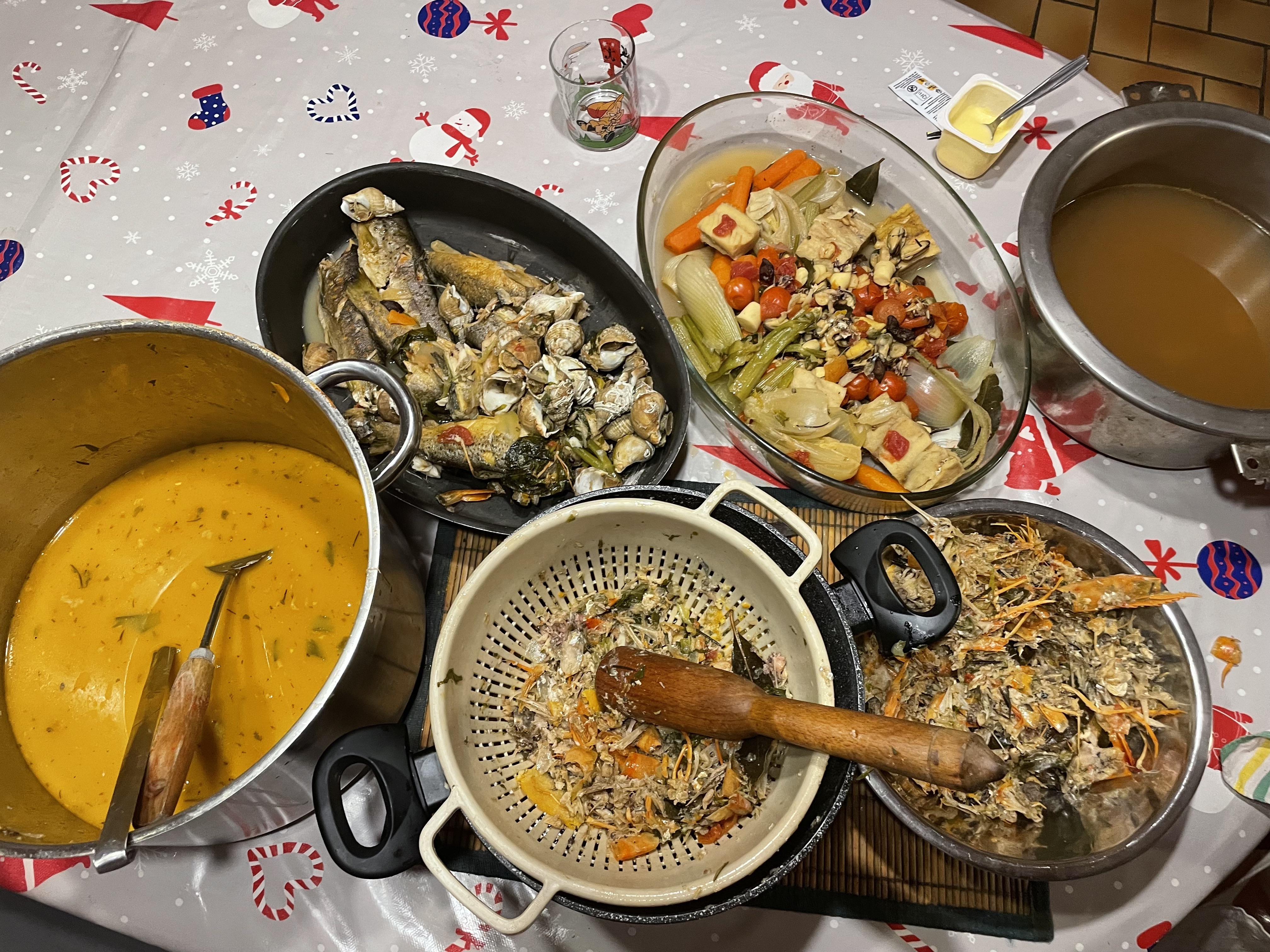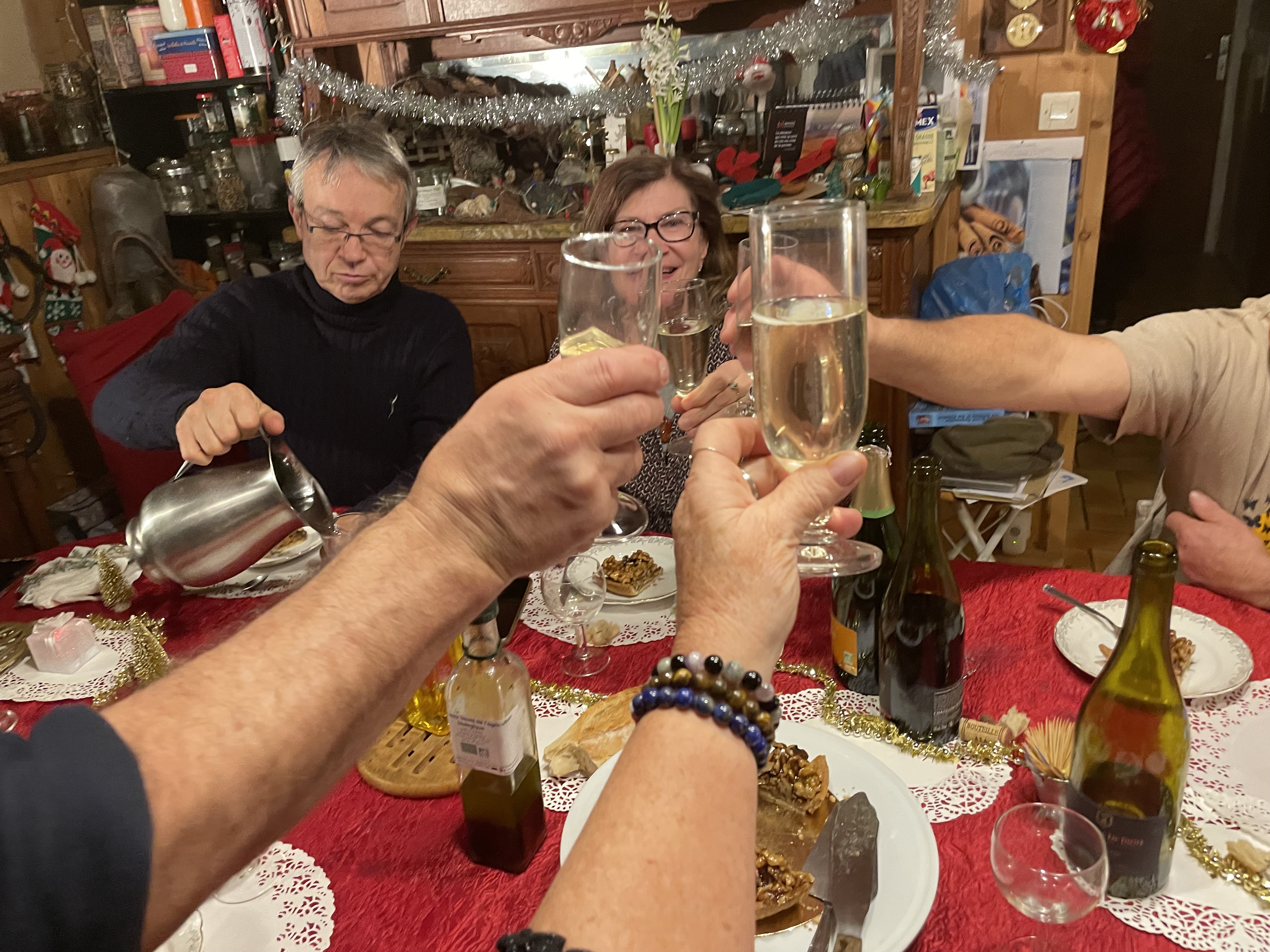 Certes, nous avons bien festoyés mais pourquoi pas avec autre chose que les traditionnelles dindes et plus ! Alors, entre soupe au pistou, et surtout une bouillabaisse à 2000m d'altitude, y compris la rouille faite maison, c'est toujours pour moi un plaisir de cuisiner ainsi ! Idem pour les gâteaux de Noël et les 13 desserts ! Et je dirais mieux, cela m'amuse follement ! Autant dire que j'ai été souvent aux fourneaux mais tout le monde mettait la main à la pâte : corvées de bois pour Manouchcka , mettre la table, et débarrasser etc... Je n'avais pas 8 bras comme Kali, la déesse dans l'indouisme. Nous représentions les 3/4 de la France, suivant les repas, car venus, des Deux-Sèvres, des Yvelines, de l'Isère, Bouches du Rhone, St Etienne, Paris, et de la Drôme, cela a fait du passage à Fontgillarde mais avec beaucoup d'amitiés et de rire ! C'est pour moi le plus important, c'est vrai !