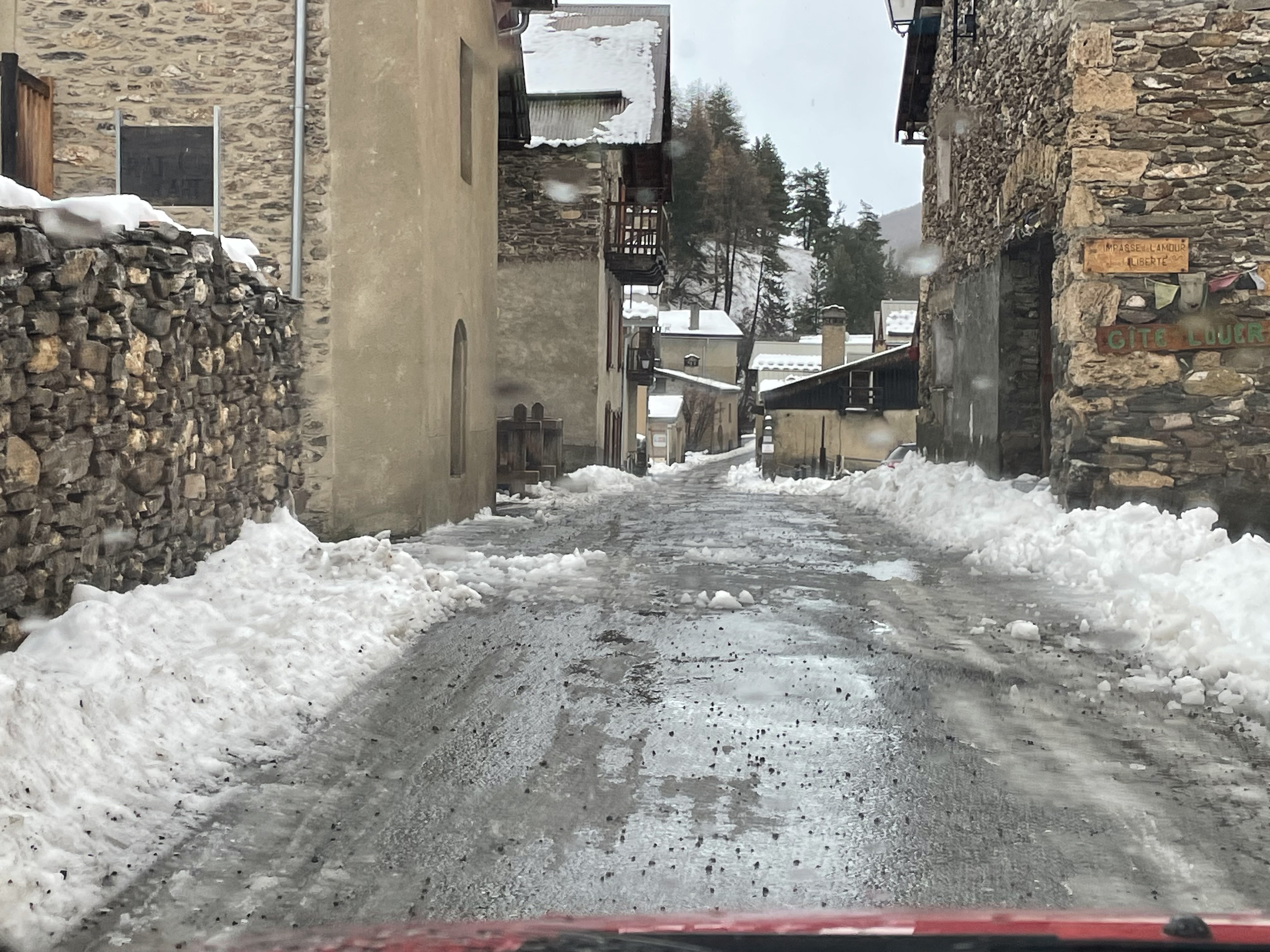 J'ai fait une halte à Barcelonnette pour le jeudi afin de faire une soirée entre fille avec Odile ! Le lendemain matin j'ai voulu passer par Jausier La Contamine mais la route avait été coupée, j'ai donc fait le tour Le Lauzet et par Savines, Embrun, car j'avais rendez-vous avec ma coiffeuse ! Mais arrivée à Châteauroux, je suis allée de surprises en surprises ! 50m après le salon de coiffure, le torrent avait emporté la route ! Entre Châteauroux et St André d'Embrun, la route était aussi un véritable torrent ! En Arrivant à Guillestre le long d'Intermaché c'était déja amplement sinistré ainsi que la route allant à Briançon au niveau d'Eygliers ! Je pensais trouver la neige en montant dans le Queyras mais c'était piscine dans les tunnels, Le Guil rugissait à la Maison du Roy ainsi que le Christillan ! Je ne parle pas des cailloux et du reste ! Je fus heureuse lorsque j'ai vu la pancarte de Molines puis de Fontgillard mais arrivée à mon chemin Peyre Bartino, la route n'était qu'une véritable patinoire sur 10cm au moins. J'ai eu peur de ne pas pouvoir tourner mais j'y suis arrivée ! Ouf !