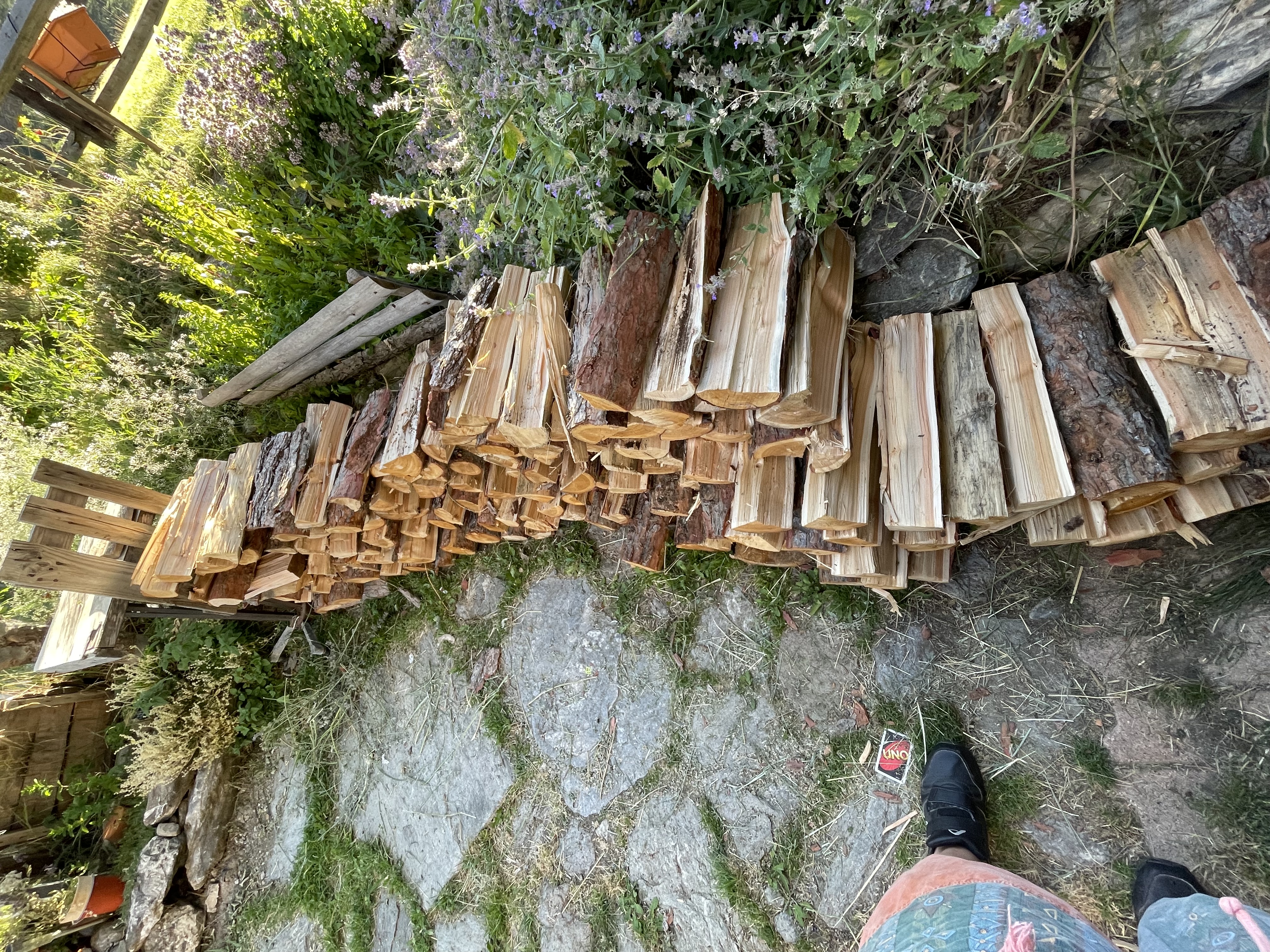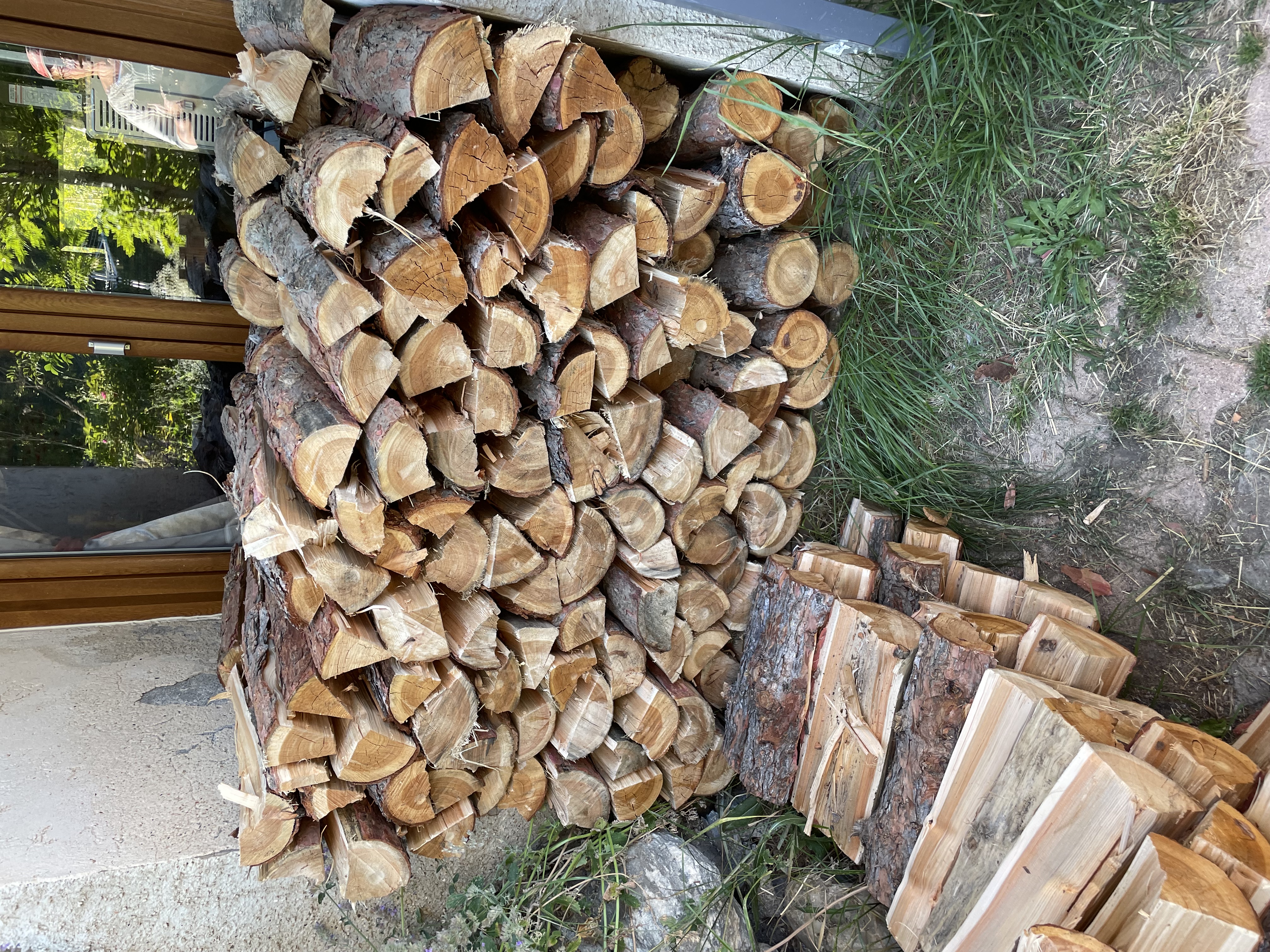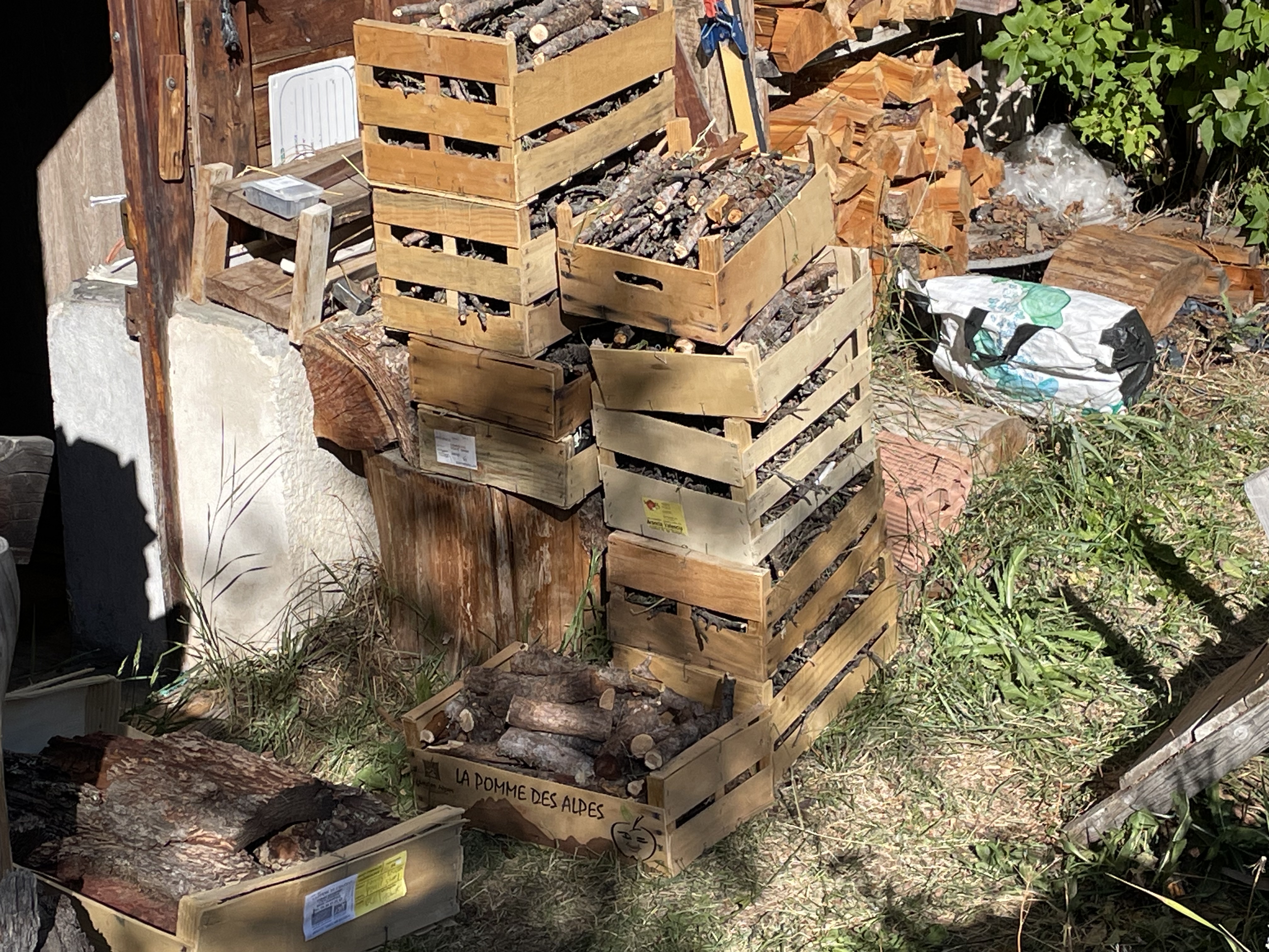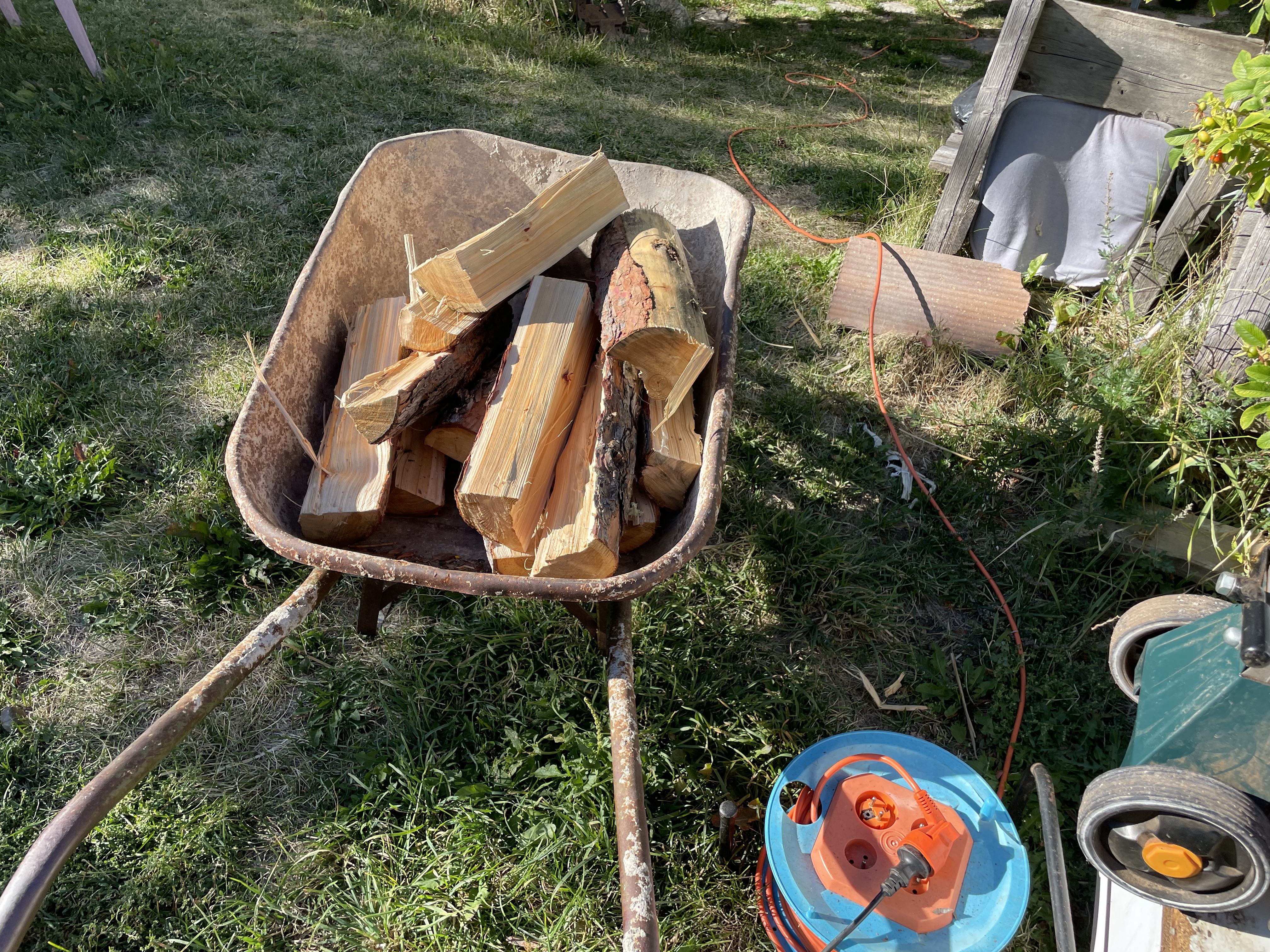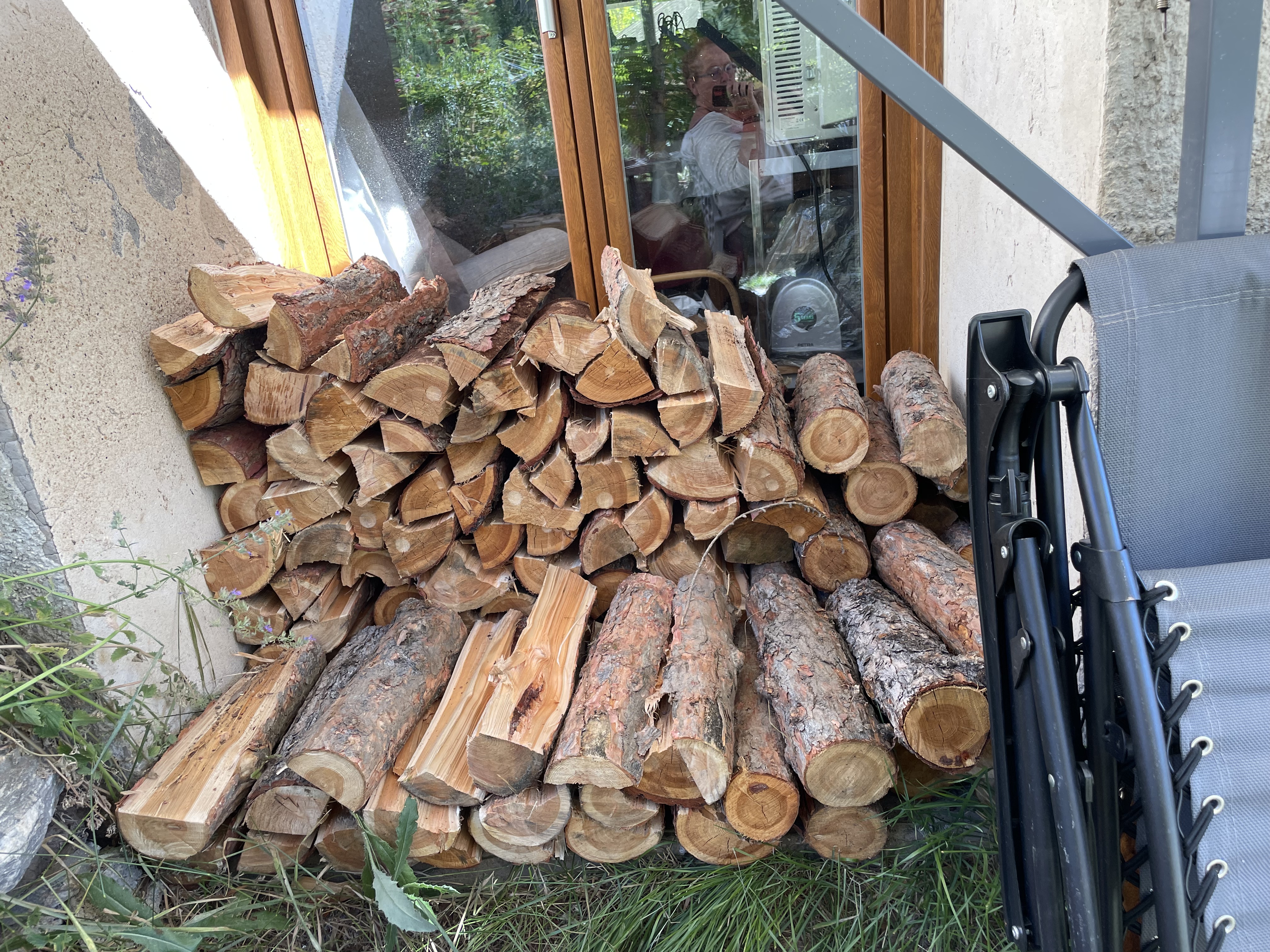 Pas de champignons en ce moment ! Il fait si sec ! Mais ma corvée de bois a commencé ! Moins gros que les années précédentes, il me faut cependant les fendre et les rentrer ou les mettre devant ma deuxième porte fenêtre afin que je ne sois pas obligée de sortir en cas de tempête ! Pas besoin de salle de sport, je brouette, porte, fends autant dire qu'après plusieurs heures mon corps commence à me rappeler qu'il existe ! Mais si je veux avoir bien chaud cet hiver, je ne dois pas chômer ! Trois heures le matin et deux en fin d'après-midi, il faut que j'alterne si je veux terminer tout mon tas avant que la neige n'arrive ! Mais je fais tout de même mon petit-dejeuner, mon repas de 13h et ma pause-café-chaise-longue ! Ben voui, je n'ai plus 20 ans !