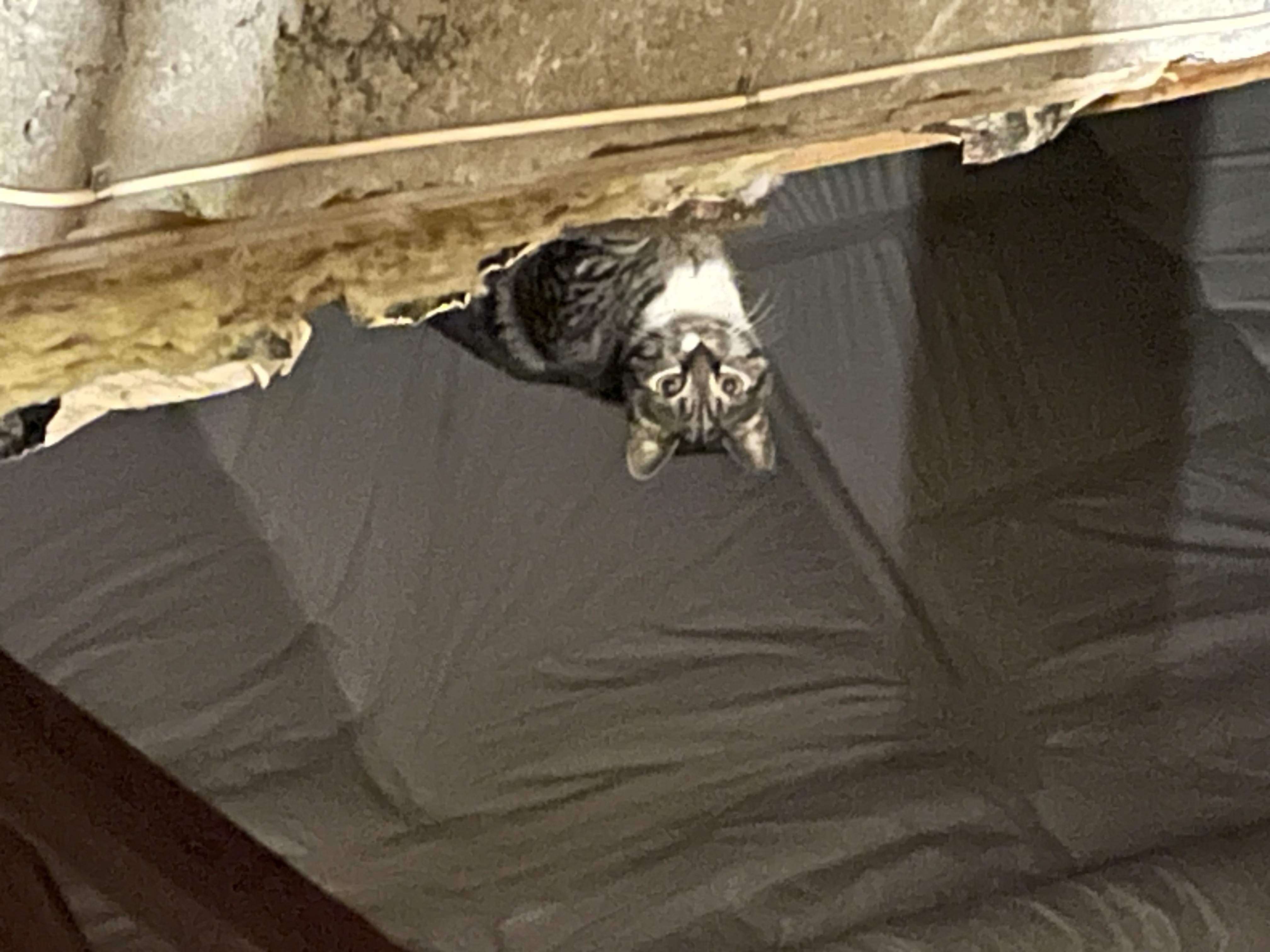 Quand je suis partie pour la fête des Mères à Toulon, j'ai ouvert la grange pour que mes chats puissent aller et venir ! Mochi en a profité pour s'installer dans le haut de la grange ! Bien que je lui donnais à manger tous les soirs, je ne la voyais jamais ! Mais je constatais que sa litière et ses gamelles avaient été utilisées ! Mais depuis presque 15 jours, elle m'attend le soir , toujours perchée certes, quand je viens lui déposer sa gamelle ! Je lui parle et elle m'observe ! Elle a même profité pendant que j'étais entrain de chercher un bouquin, une fois que je l'avais servie, de passer derrière moi pour aller manger et elle est vite retournée là-haut pour de nouveau m'observer ! Un bénévole de l'association des chats d'Arvieux qui maintenant s'intitule désormais Les Hauts Chal'pins m'a prêtée une caméra et j'ai pu l'observer se baladant jusqu'en bas des escaliers la nuit pour grignoter aux différentes gamelles que j'ai installé afin que petit à petit elle se socialise ! J'avais moi-même une petite caméra espion mais c'était impossible de l'installer ! Mais aujourd'hui, mon technicien d'ordinateur m'a tout installé en même temps que ma ré-installation de cette page ! Comme j'ai une alarme, je peux la voir évoluer dans la grange sans la déranger ! D'ailleurs je viens de voir qu'elle s'est mise en position d'attente puisqu'il est 19h passé et que je ne vais pas tarder à lui monter son repas en ce qui concerne les sachets ou la boite, les croquettes étant à volonté par un distributeur pour l'instant ! D'après les vétérinaires , il me faudra bien patienter un an avant qu'elle comprenne que je suis une humaine qui la protège ! Et c'est vrai car tous les adoptants enfin les 3/4, nous sommes sur WhatsApp et ceux qui ont adopté y'a un an ou moins nous montres les progres par photos ou vidéo ! Donc, une belle petite chatte qui a eu l'habitude de chasser les souris pour se nourrir ! Dans quelques jours je déplacerais ma caméra pour voir si elle sort la nuit par la chatière comme Petiroux et comme faisait aussi Baguera-Mimine !