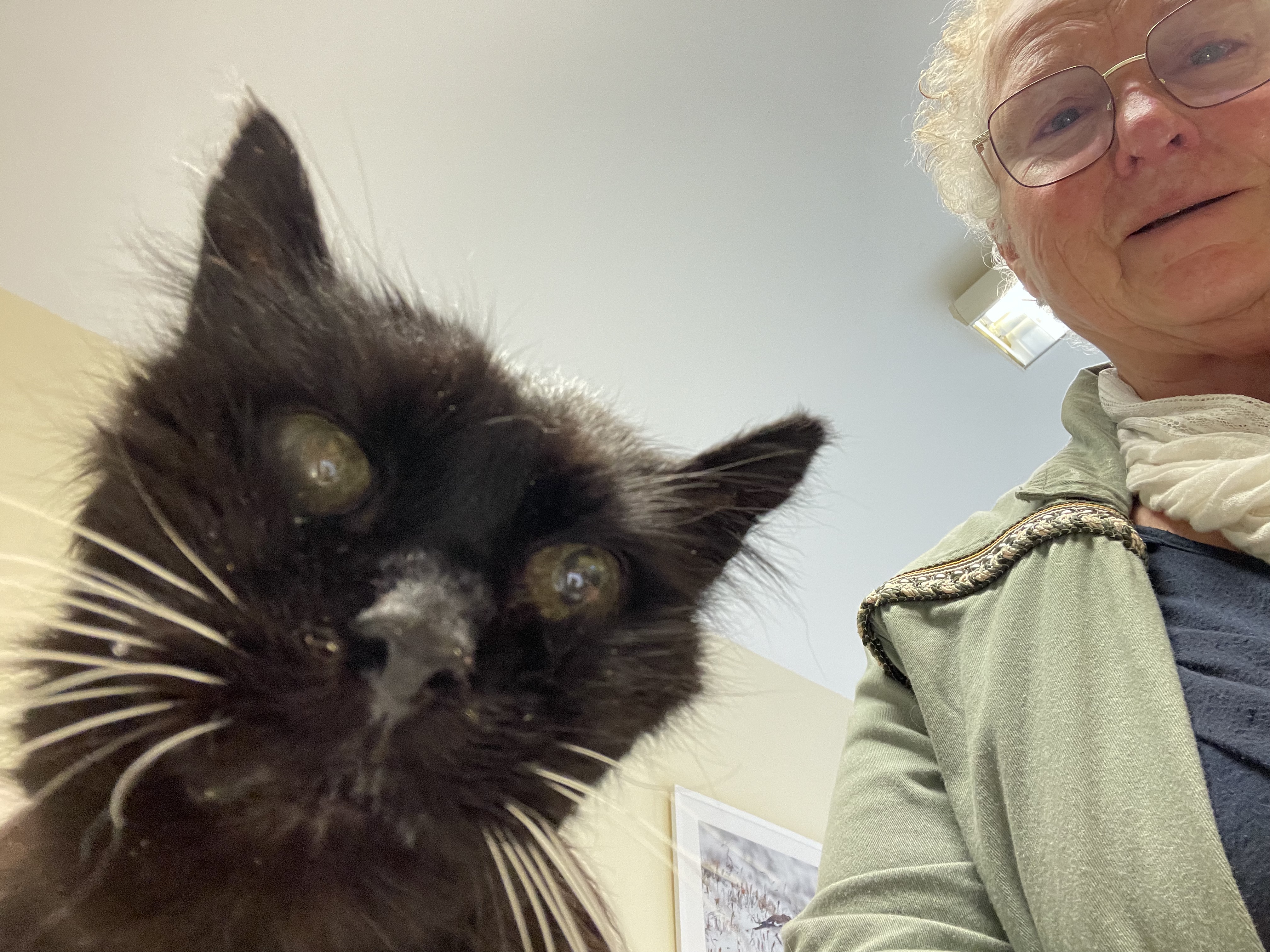 Certes ma Baguera-Mimine avait 22 ans mais elle allait bien encore comme une petite mémé c'était normal vu son âge ! Mais hélàs, elle a développé très rapidement un cancer de la mâchoire inférieure, à la manière des os en verre ! Donc, impossible de la soigner ! Le pronostic est arrivée vendredi dernier et samedi matin je suis allée à Embrun pour l'accompagner dans sa fin de vie et faire une dernière photo avec elle, afin qu'elle vous dise aussi au revoir à sa manière ! Elle s'est endormie définitivement sous mes caresses ! Un moment difficile pour accepter 22 ans de vie avec elle qui se tourne. C'était la première chatte que nous avions adoptée avec Antoine ! Une petite boule de poil noir, sauvage puisqu'elle vivait dans la grange de Pierre Roux. Il était très difficile de l'approcher tant elle feulait toutes griffes dehors ! Ces dernières années, elle réclamait des caresses, dormant le plus souvent sur mon lit ou près du radiateur du Squatte au premier étage. Mais aussi au petit matin quand elle décidait que j'avais trop dormi, elle glissait sa patte sous l'élastique de mon masque d'apnée du sommeil et me le faisait claquer contre ma joue ou bien doucement sans griffe, elle me tapotait la joue. J'aurais mille choses à raconter sur cette petite chasseresse qui dès ses 3 mois chassait les souris... mais aussi les oiseaux ! Cependant je n'avais plus de souris à la maison ! Sauf cette année ! C'est elle aussi qui a initié Petiroux et Domino son frère comme une maman d'adoption. Petiroux l'a cherché du vendredi à ce jour. Maintenant, il est devenu une véritable Arapède, se collant à moi presque toute la journée et la nuit !